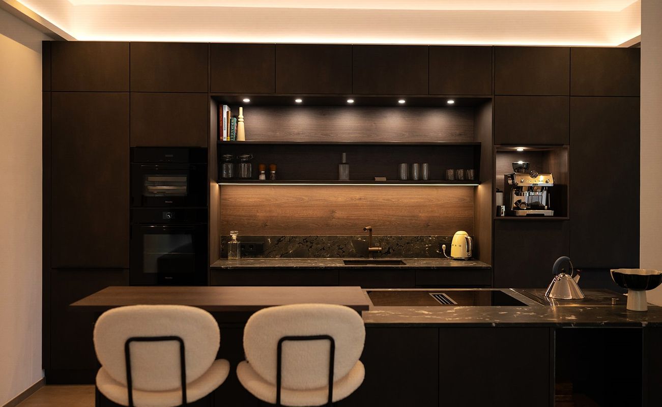 Dieses Projekt vereint moderne Klarheit mit warmer Wohnlichkeit und präziser Planung. Küche und Wohnen verschmelzen zu einem offenen Raumkonzept mit ruhiger, reduzierter Formensprache. Dunkle, matte Fronten, fein strukturierte Holzoberflächen und eine ausdrucksstarke Naturstein-Arbeitsplatte prägen die Küche als architektonisches Zentrum. Sanfte Beleuchtung setzt gezielte Akzente und verleiht dem Raum Tiefe. Helle Polstermöbel und maßgefertigte Einbauten schaffen einen harmonischen Ausgleich und unterstreichen den wohnlichen Charakter. Ein durchgängiges Material- und Farbkonzept verbindet alle Bereiche zu einer zeitlosen, eleganten Gesamtkomposition.